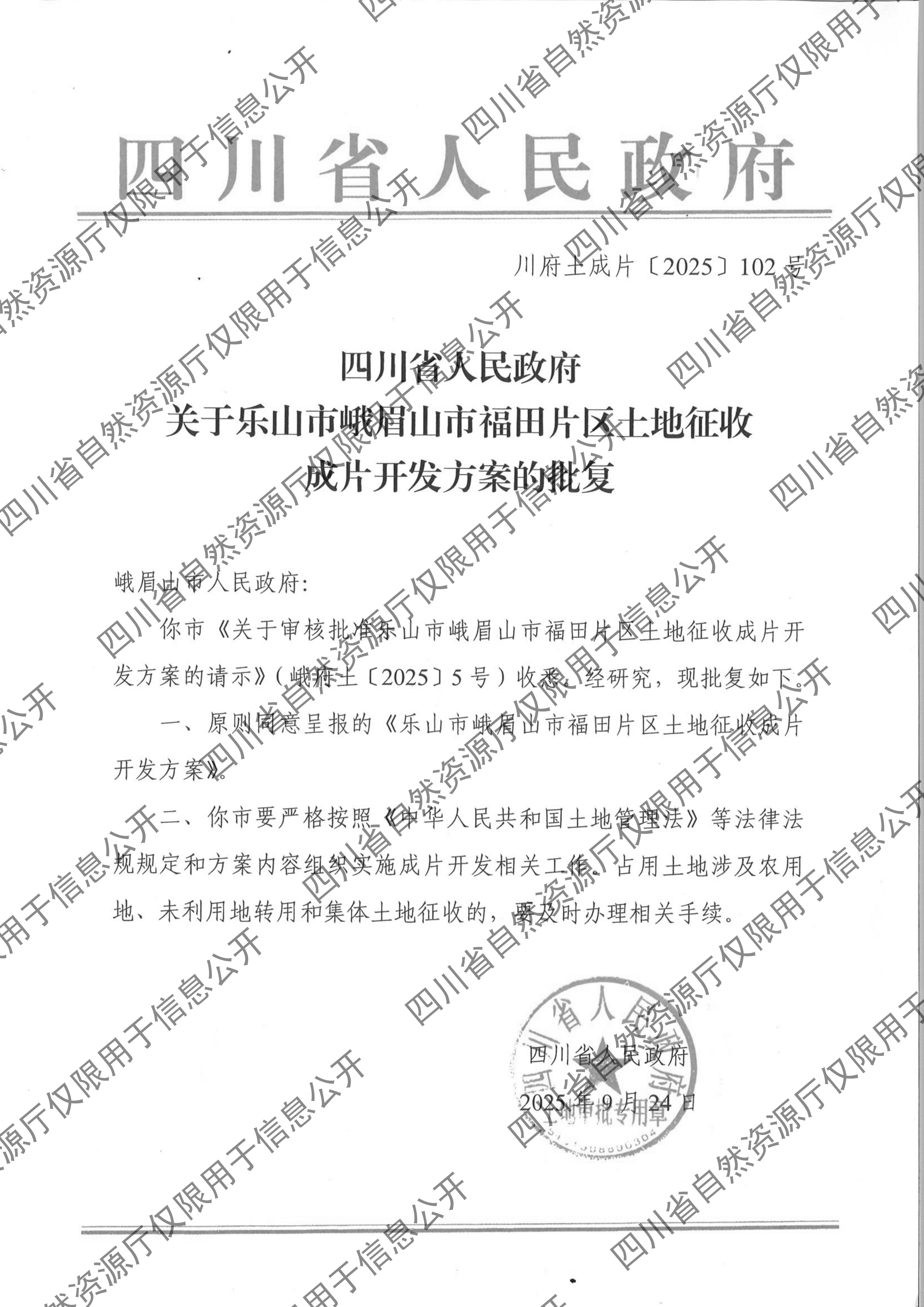 四川省人民政府关于乐山市峨眉山市福田片区土地征收成片开发方案的批复