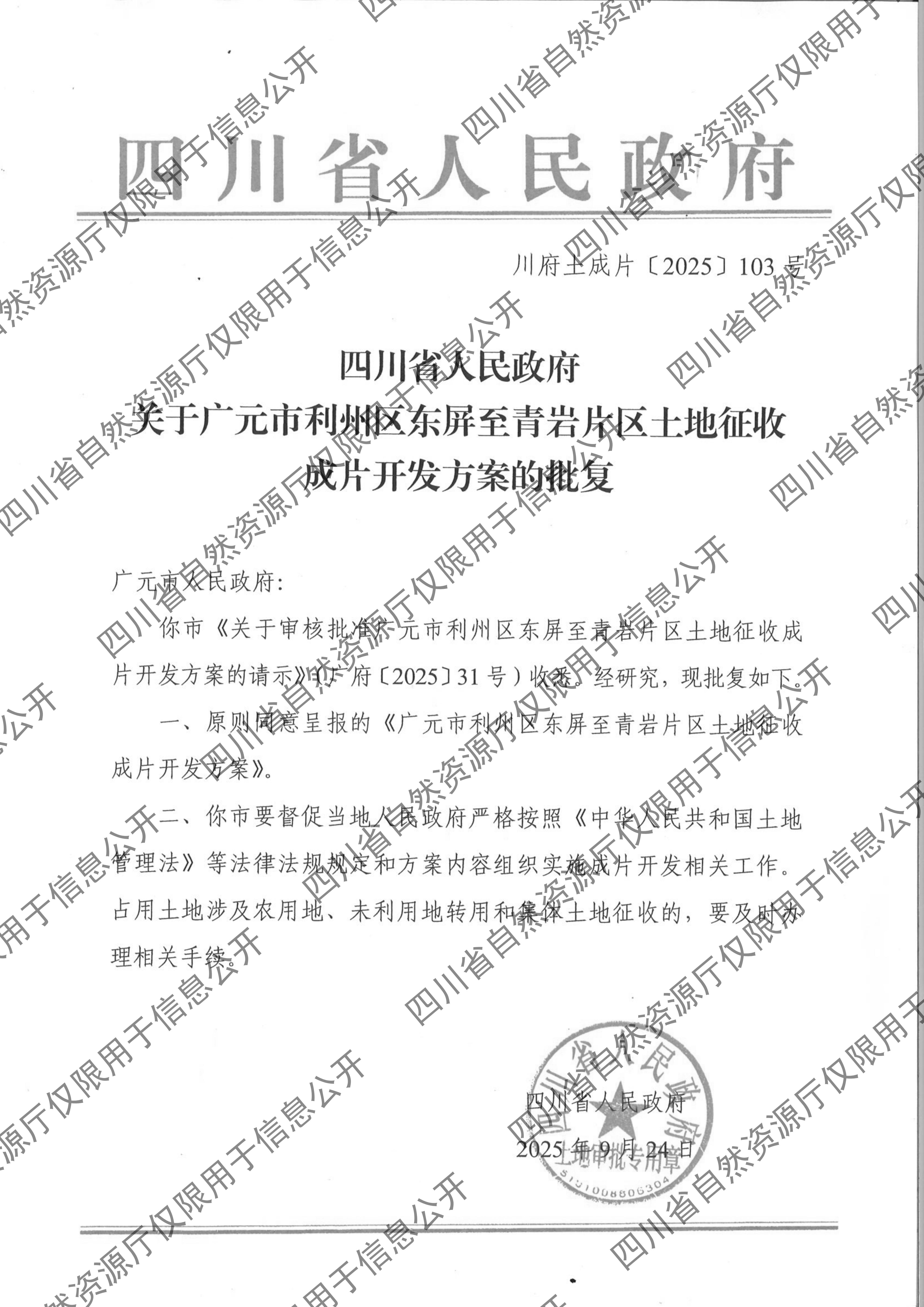 四川省人民政府关于广元市利州区东屏至青岩片区土地征收成片开发方案的批复