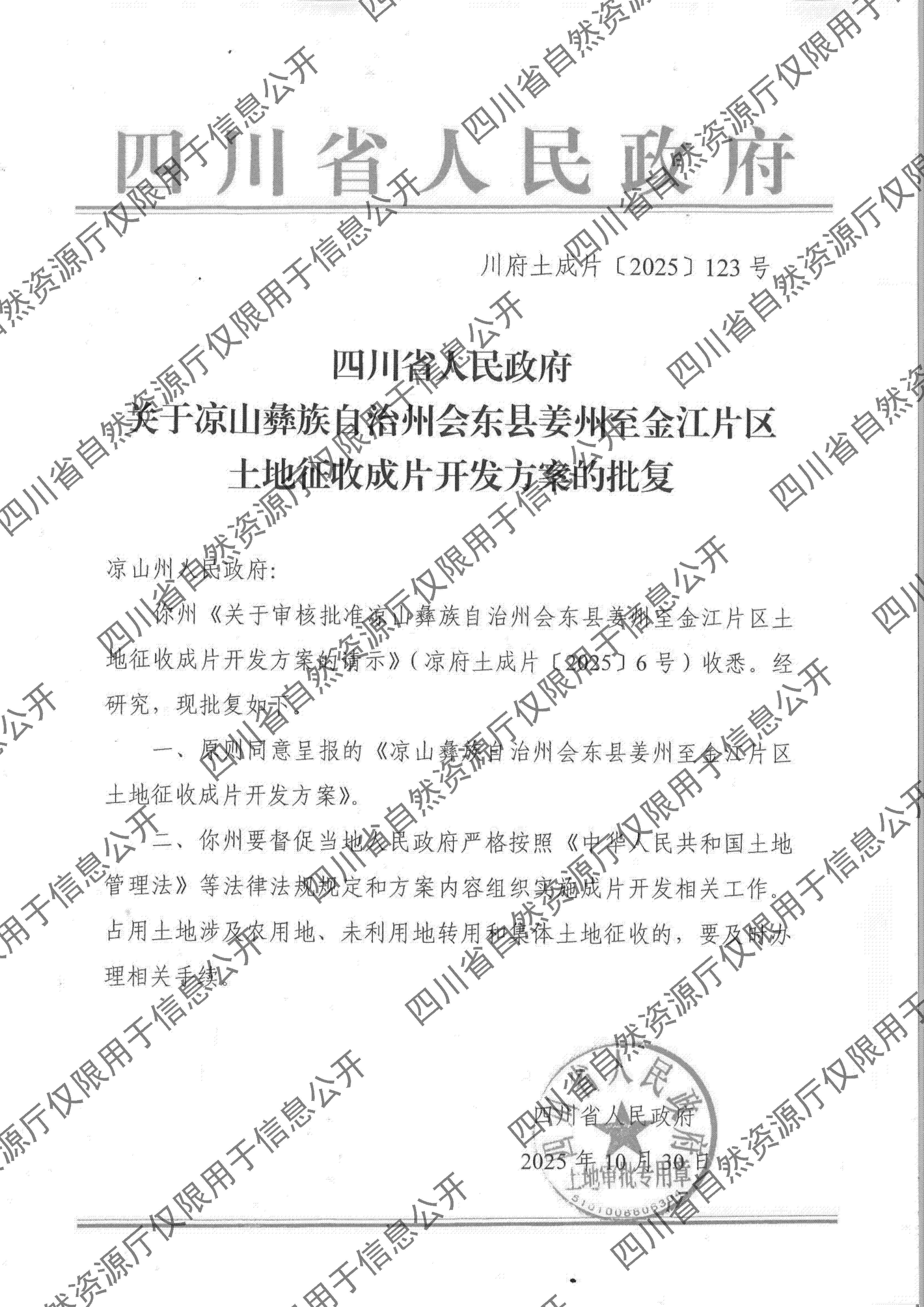 四川省人民政府关于凉山彝族自治州会东县姜州至金江片区土地征收成片开发方案的批复