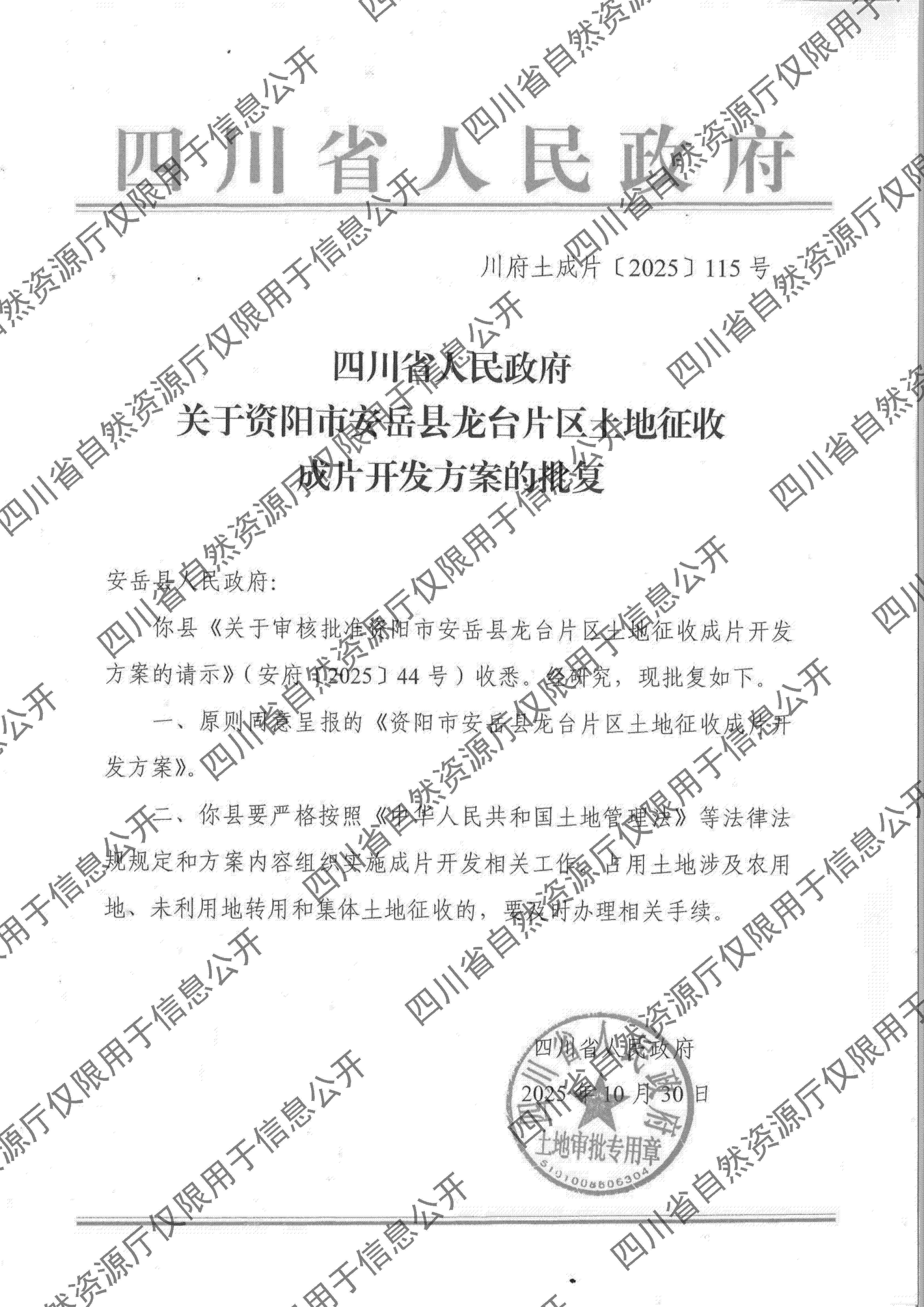 四川省人民政府关于资阳市安岳县龙台片区土地征收成片开发方案的批复