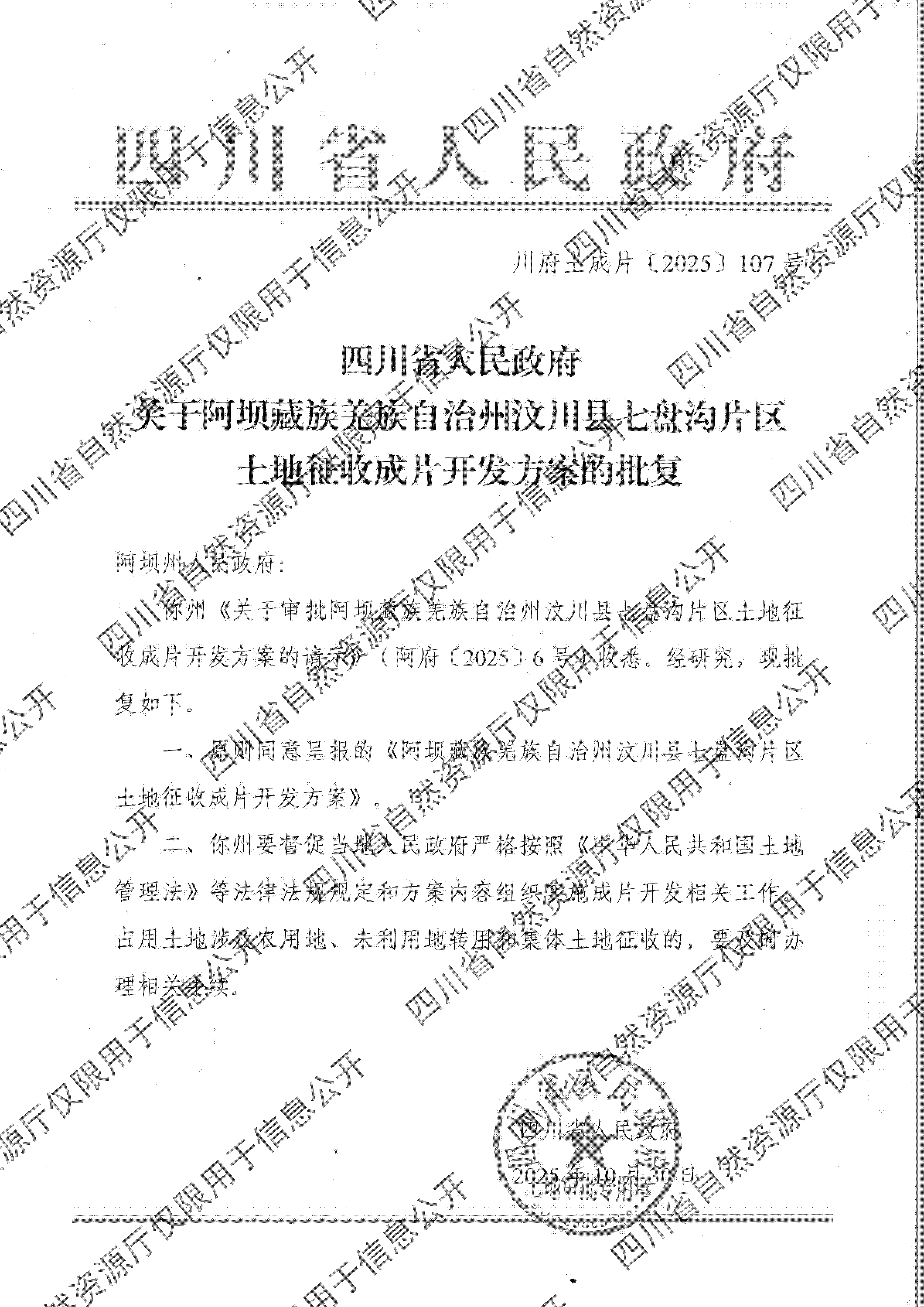 四川省人民政府关于阿坝藏族羌族自治州汶川县七盘沟片区片区土地征收成片开发方案的批复