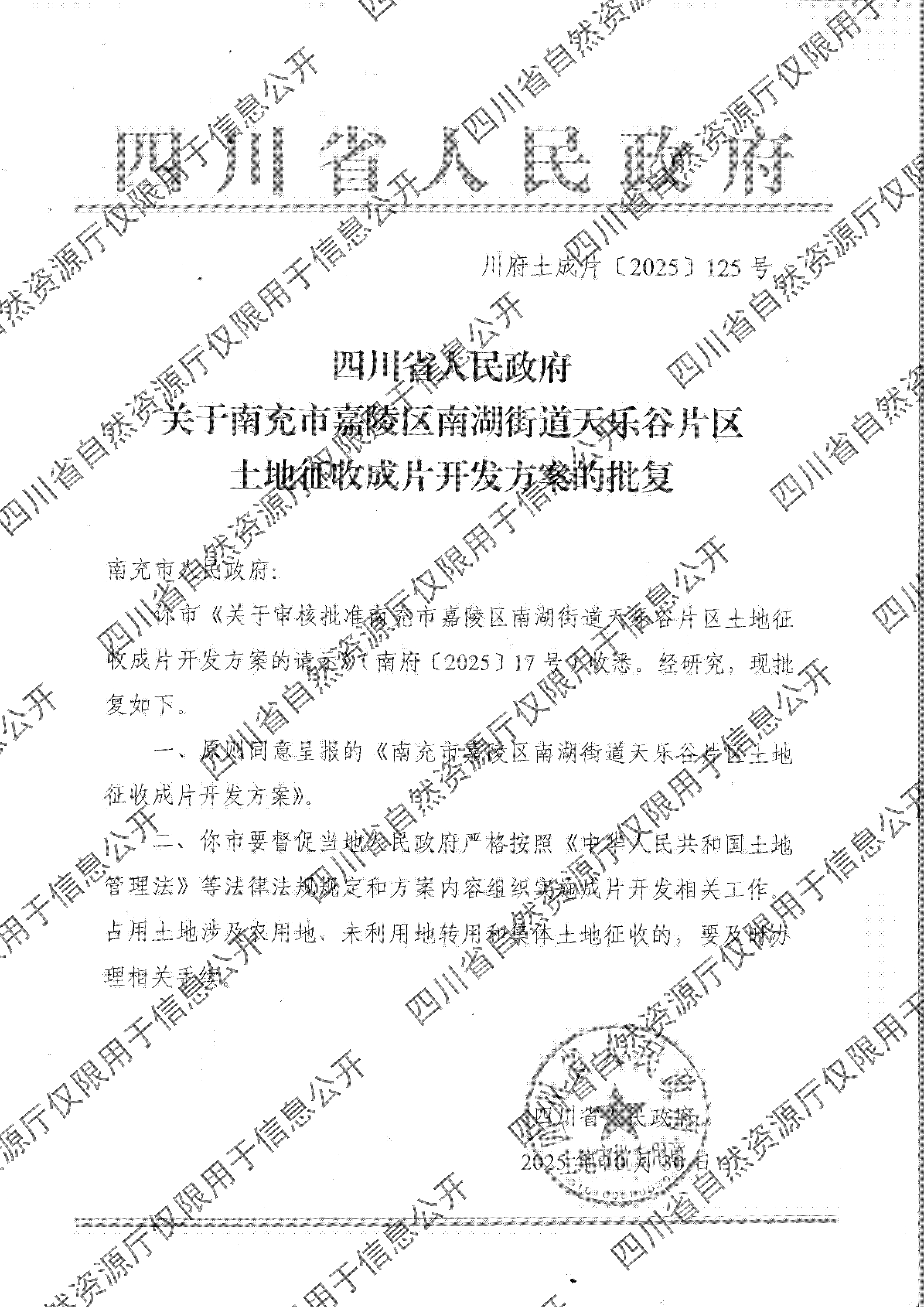 四川省人民政府关于南充市嘉陵区南湖街道天乐谷片区土地征收成片开发方案的批复