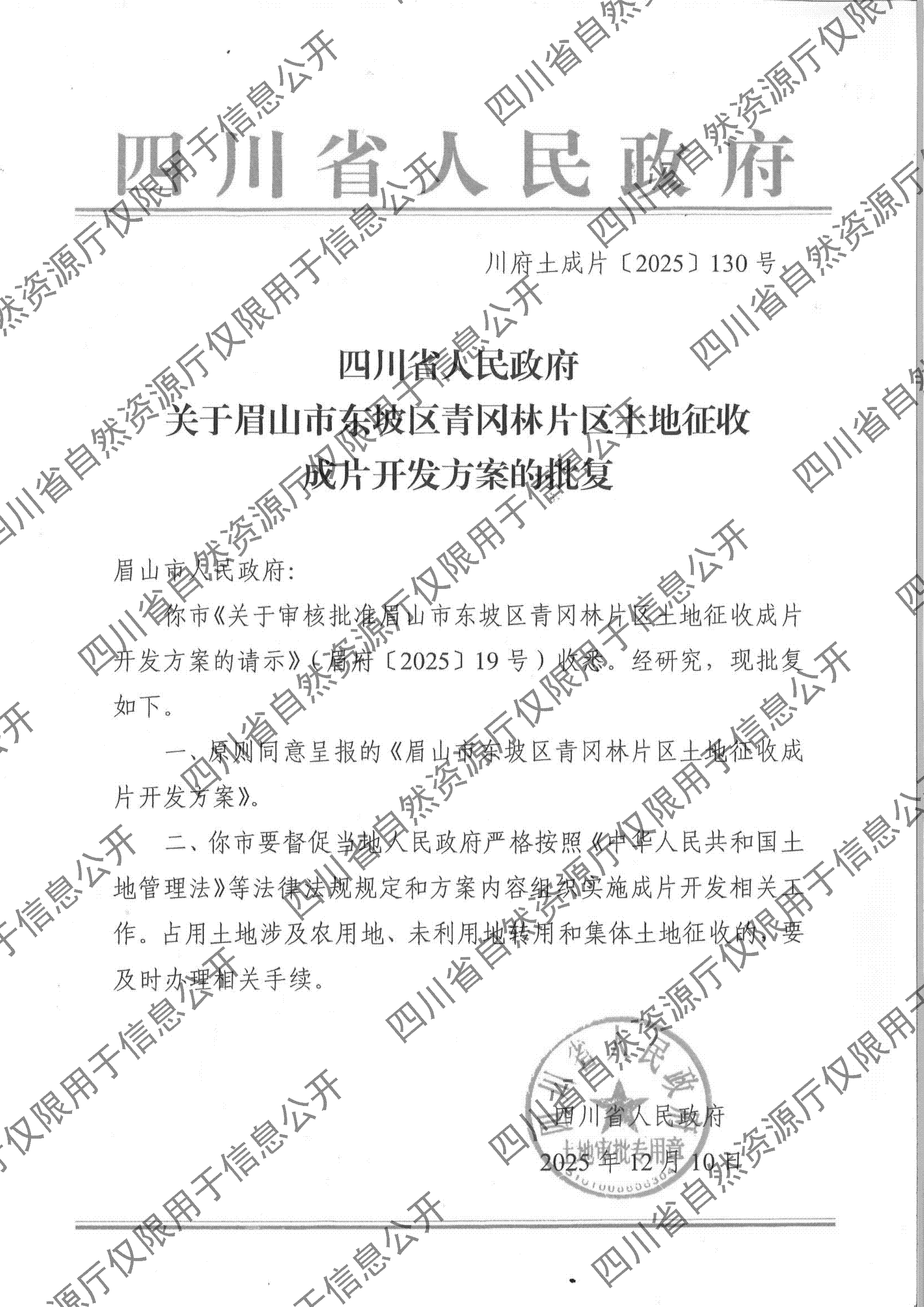 四川省人民政府关于眉山市东坡区青冈林片区土地征收成片开发方案的批复