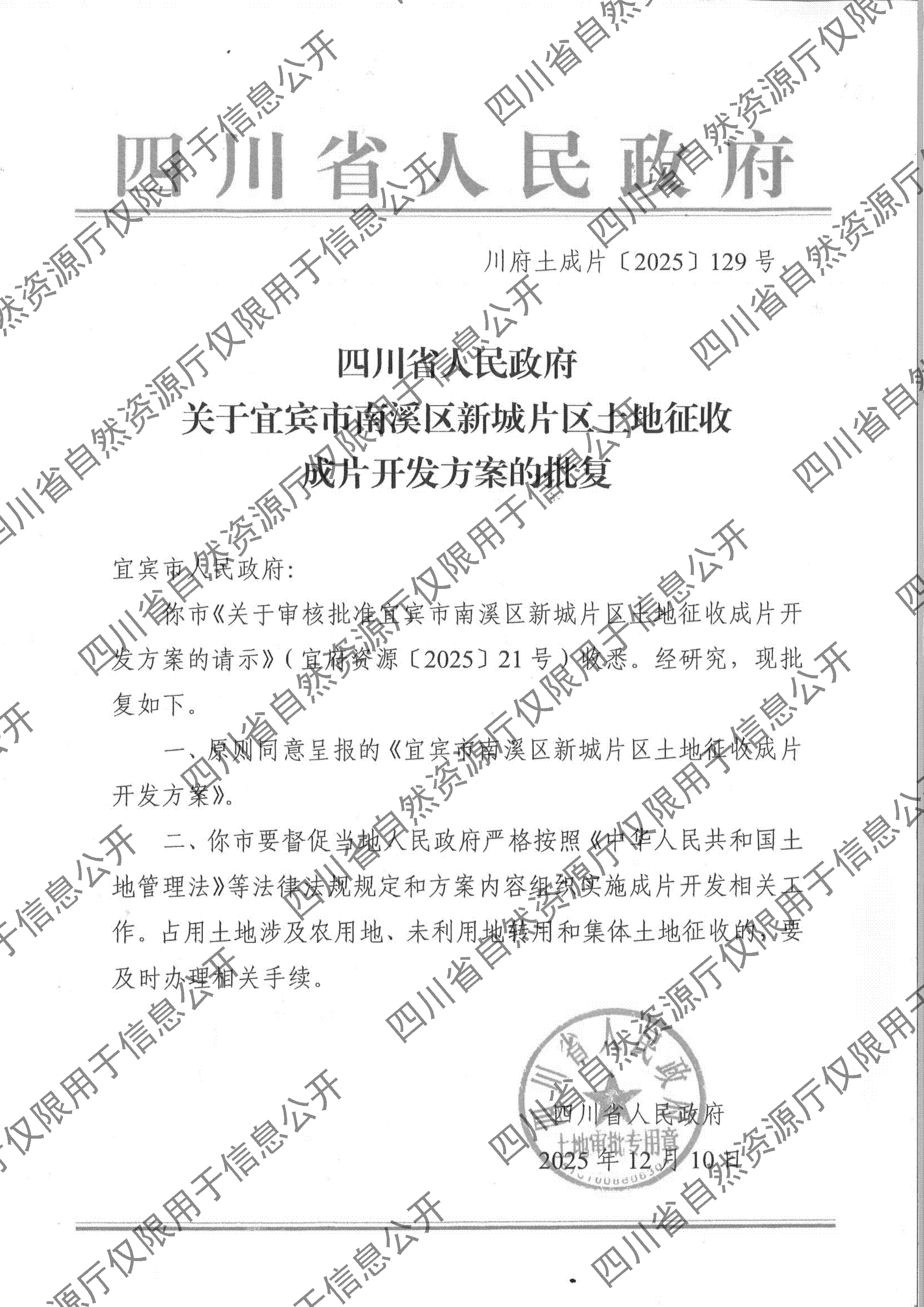 四川省人民政府关于宜宾市南溪区新城片区土地征收成片开发方案的批复