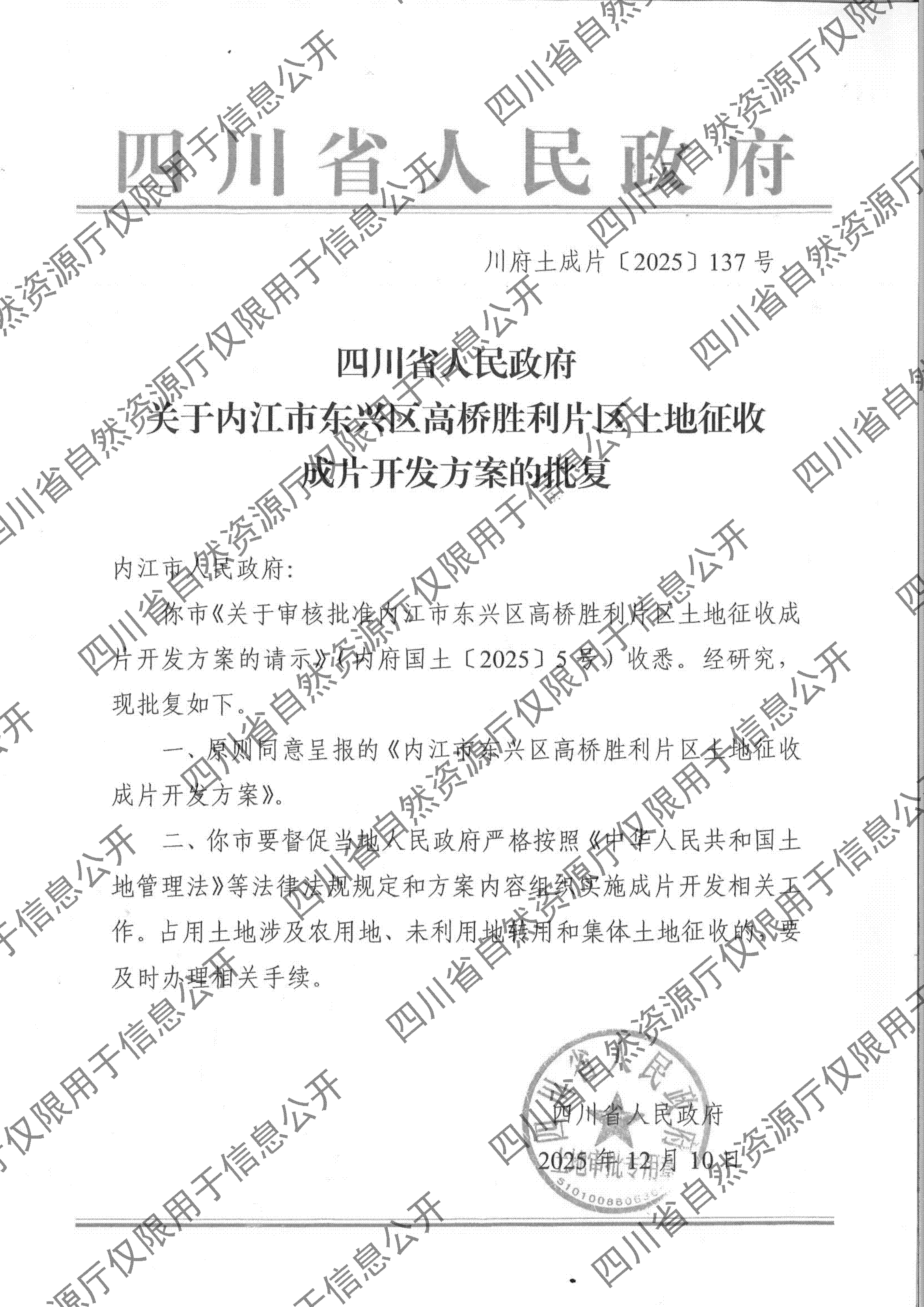 四川省人民政府关于内江市东兴区高桥胜利片区土地征收成片开发方案的批复