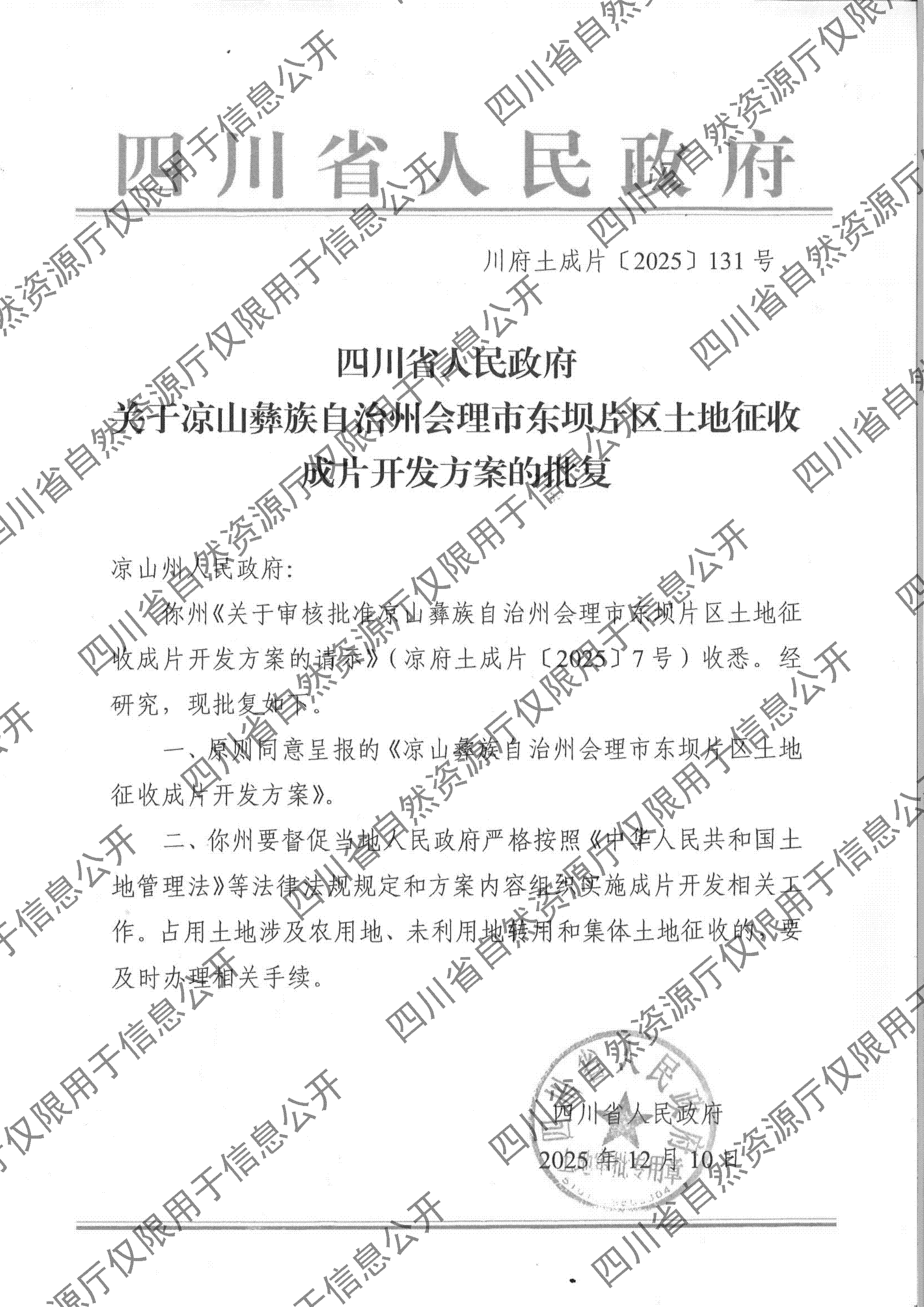 四川省人民政府关于凉山彝族自治州会理市东坝片区土地征收成片开发方案的批复