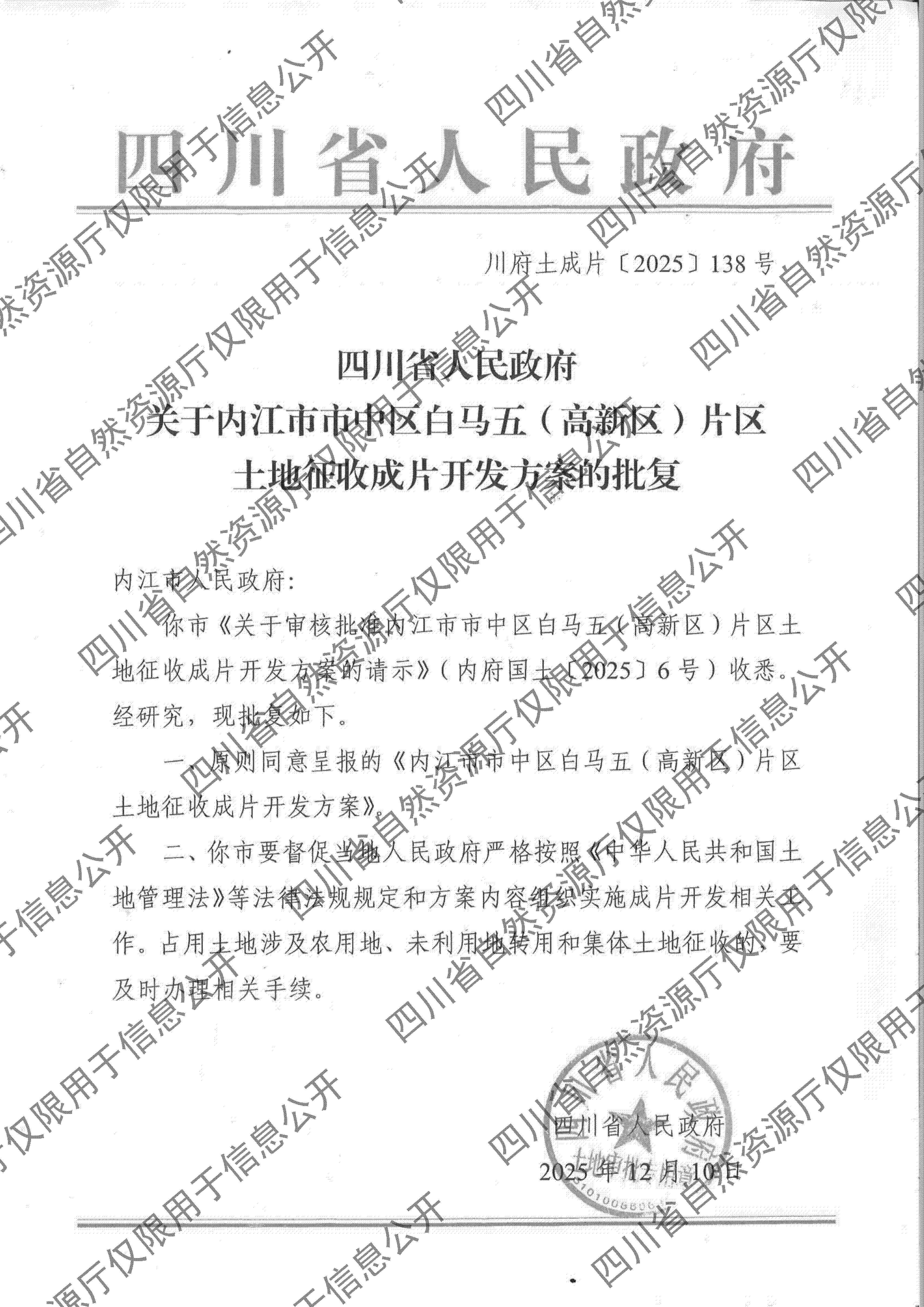 四川省人民政府关于内江市市中区白马五(高新区)片区土地征收成片开发方案的批复