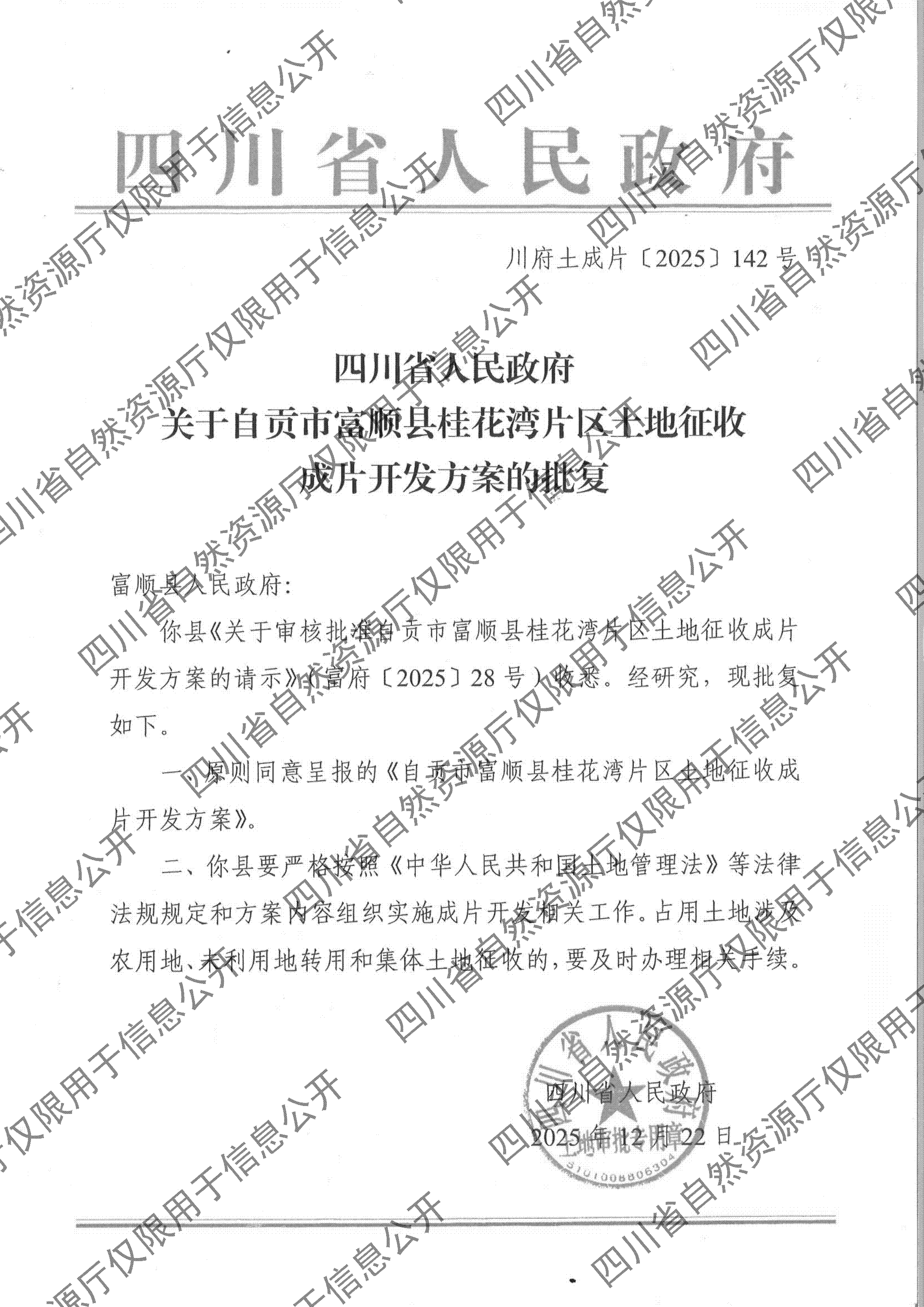 四川省人民政府关于自贡市富顺县桂花湾片区土地征收成片开发方案的批复