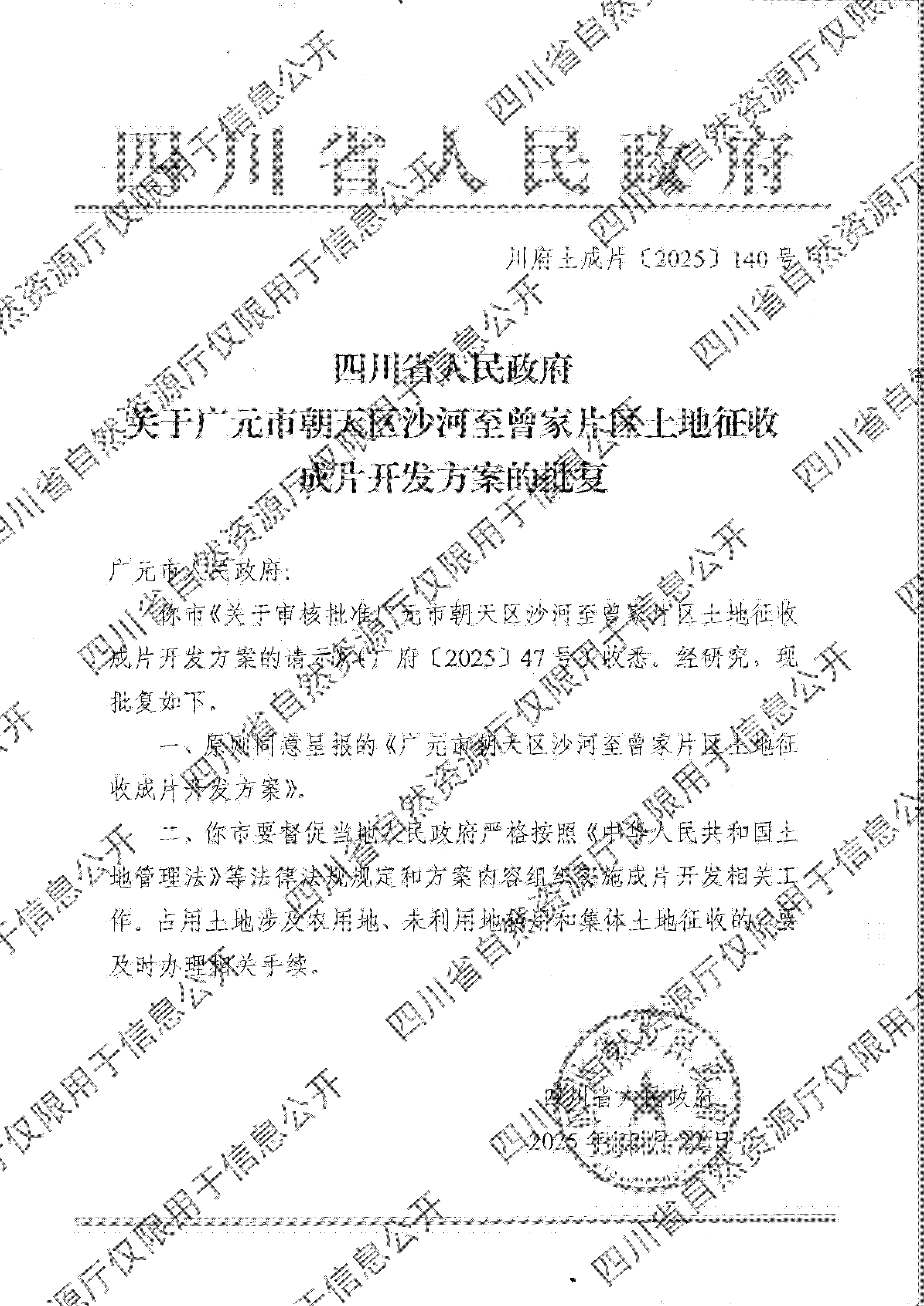 四川省人民政府关于广元市朝天区沙河至曾家片区土地征收成片开发方案的批复