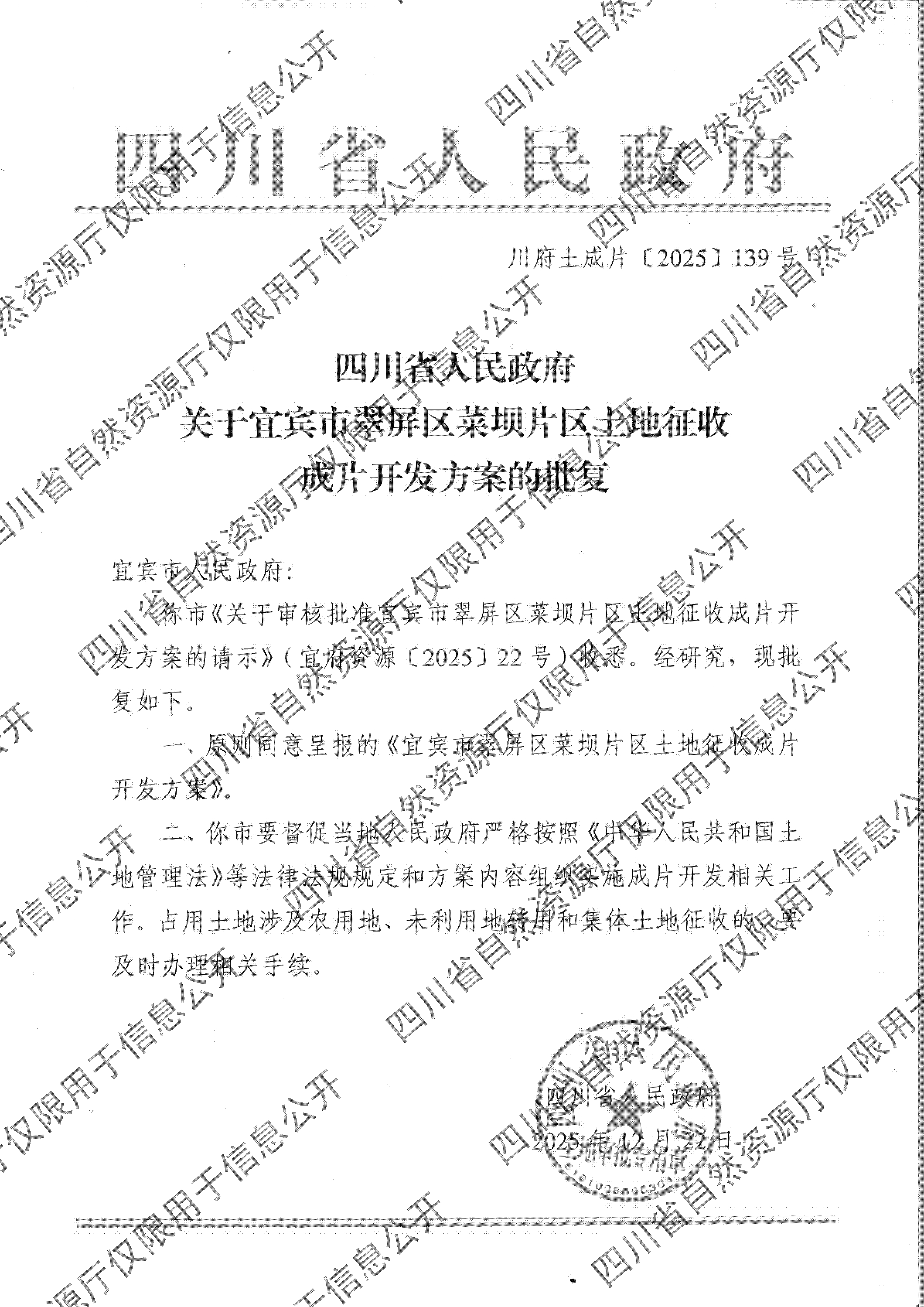 四川省人民政府关于宜宾市翠屏区菜坝片区土地征收成片开发方案的批复