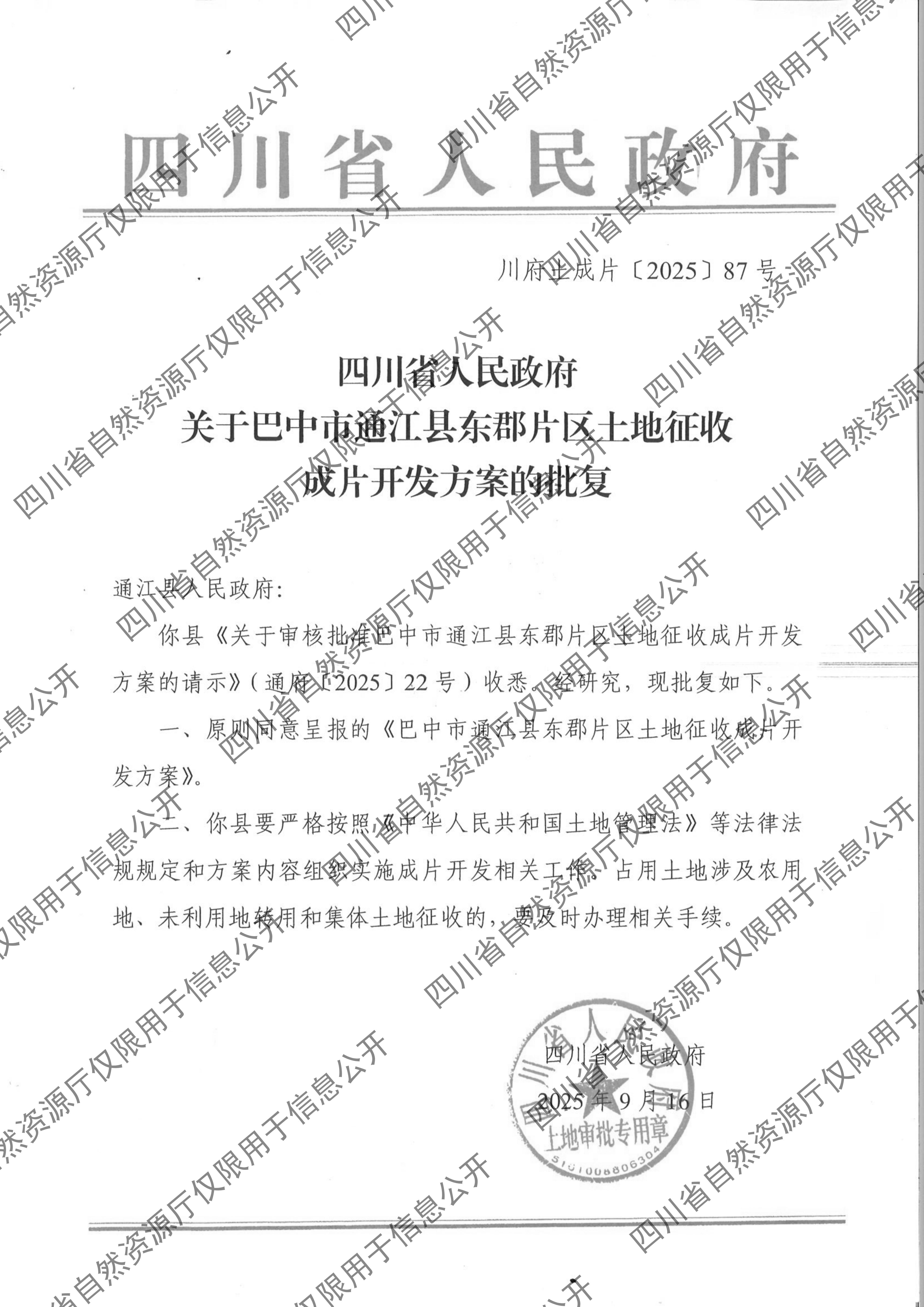 四川省人民政府关于巴中市通江县东郡片区土地征收成片开发方案的批复