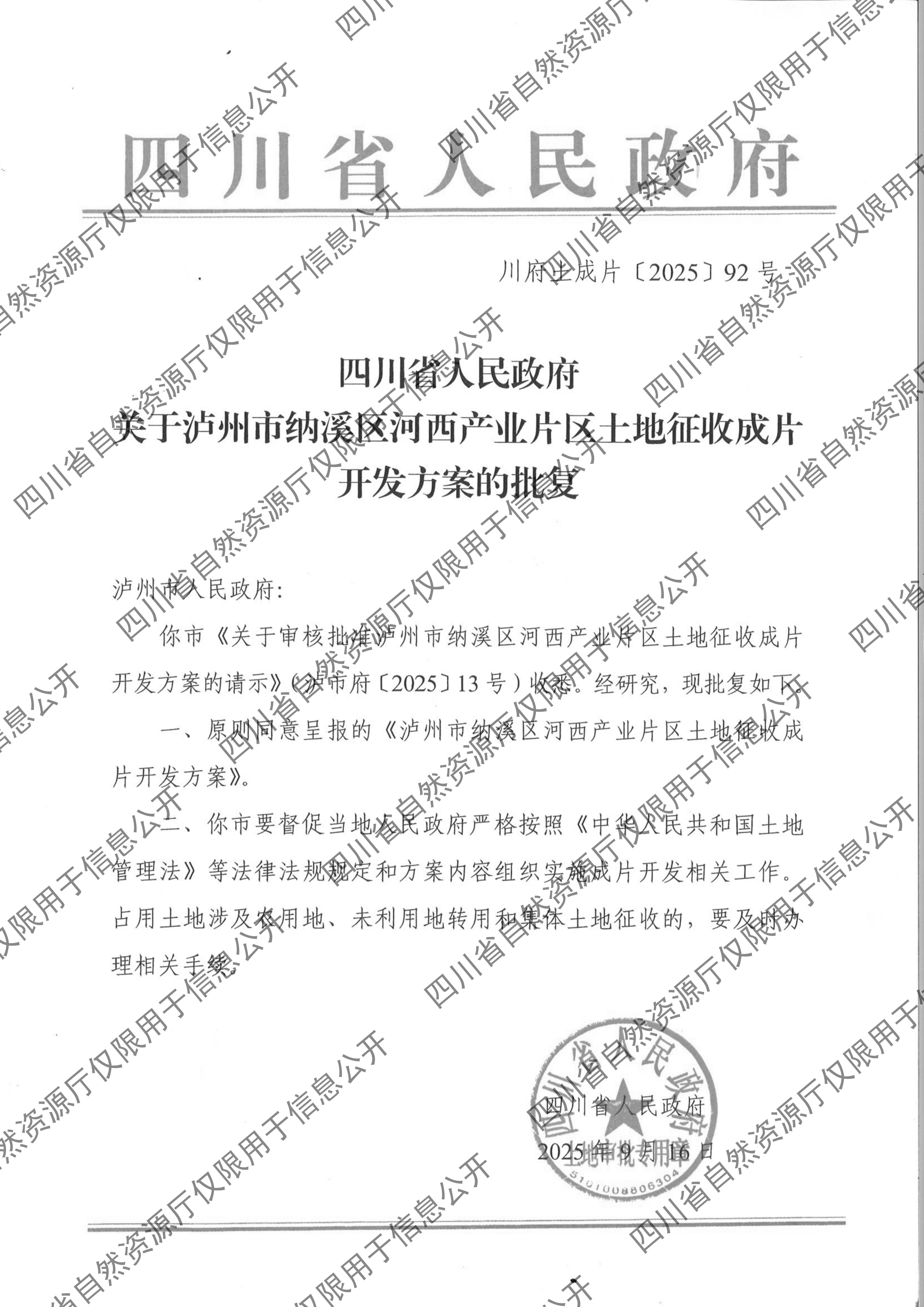 四川省人民政府关于泸州市纳溪区河西产业片区土地征收成片开发方案的批复