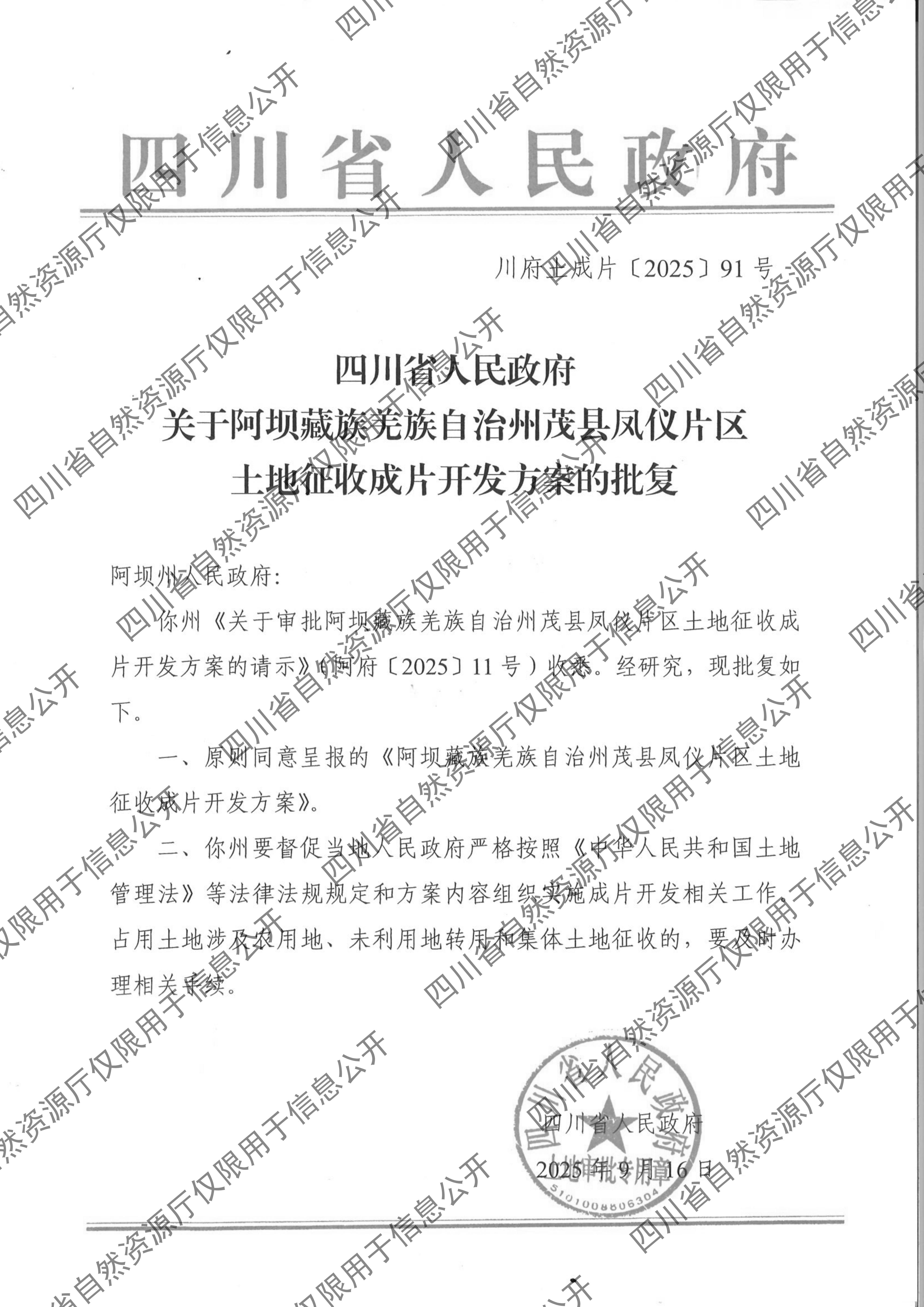 四川省人民政府关于阿坝藏族羌族自治州茂县凤仪片区土地征收成片开发方案的批复