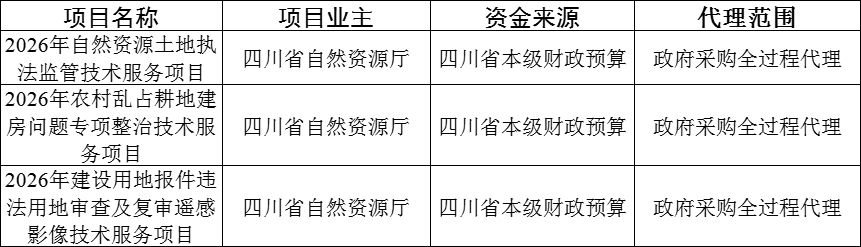 为做好2026年自然资源土地执法监管技术服务项目等3个项目政府采购工作,根据《中共四川省自然资源厅党组关于印发〈四川省自然资源厅政府采购内控管理制度〉等4个文件的通知》(川自然资党发〔2022〕16号)有关要求,我厅诚邀符合条件的政府采购代理机构报名,有意愿参与本次代理服务的,请按照本公告要求提交相应文件。