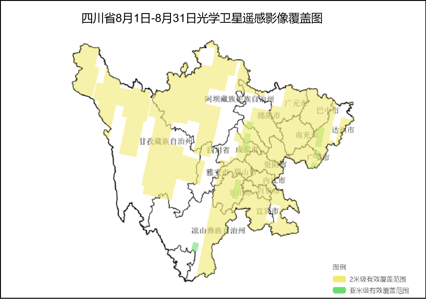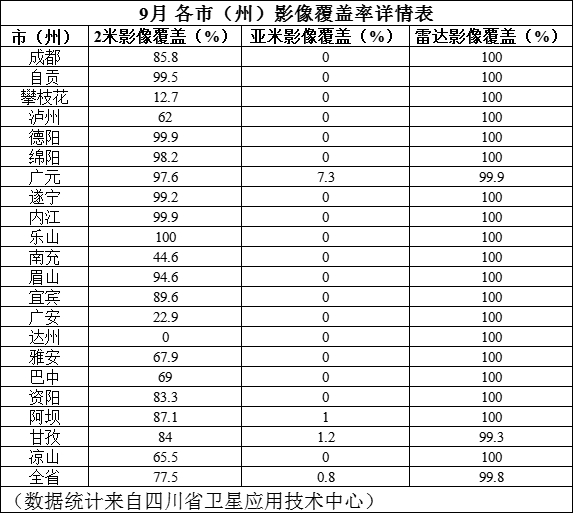 2025年9月1日至30日,四川省国土科学技术研究院(四川省卫星应用技术中心)获取光学卫星遥感影像涉及我省成都、自贡、攀枝花、泸州、德阳、绵阳、广元、遂宁、内江、乐山、南充、眉山、宜宾、广安、达州、雅安、巴中、资阳、阿坝、甘孜、凉山21个市(州)的167个县(市、区),覆盖面积37.69万平方公里,其中69个县(市、区)达到100%覆盖。亚米级影像覆盖面积0.39万平方公里。本月全省雷达卫星遥感影像覆盖率达99.8%,覆盖面积48.51万平方公里。