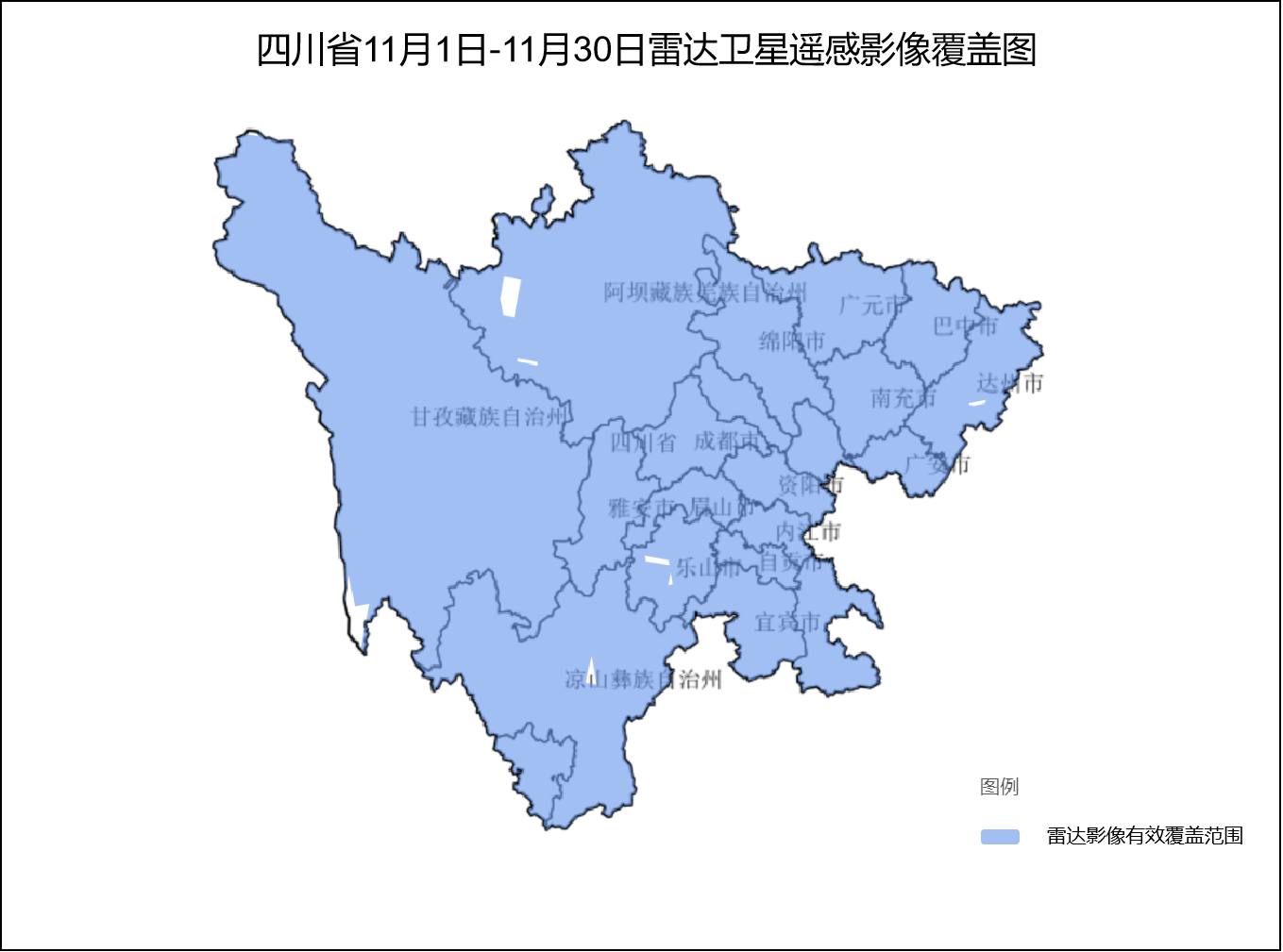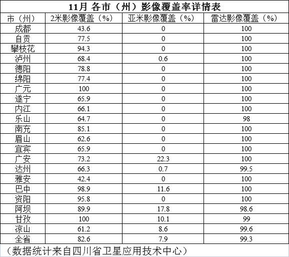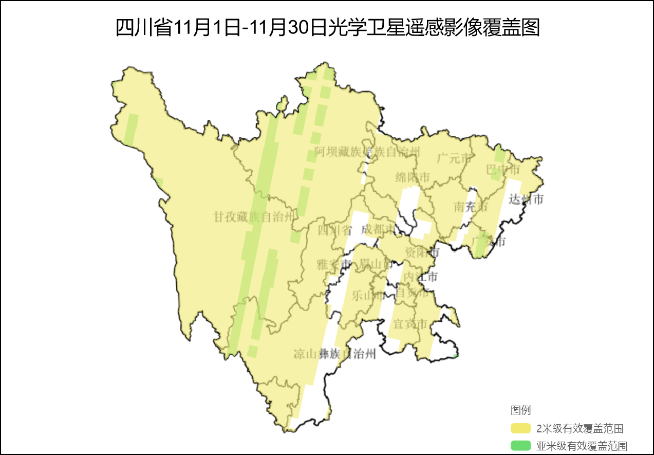 2025年11月1日至30日,四川省国土科学技术研究院(四川省卫星应用技术中心)获取光学卫星遥感影像涉及我省成都、自贡、攀枝花、泸州、德阳、绵阳、广元、遂宁、内江、乐山、南充、眉山、宜宾、广安、达州、雅安、巴中、资阳、阿坝、甘孜、凉山21个市(州)的172个县(市、区),覆盖面积40.21万平方公里,其中77个县(市、区)达到100%覆盖。亚米级影像覆盖面积3.82万平方公里。本月全省雷达卫星遥感影像覆盖率达99.3%,覆盖面积48.29万平方公里。