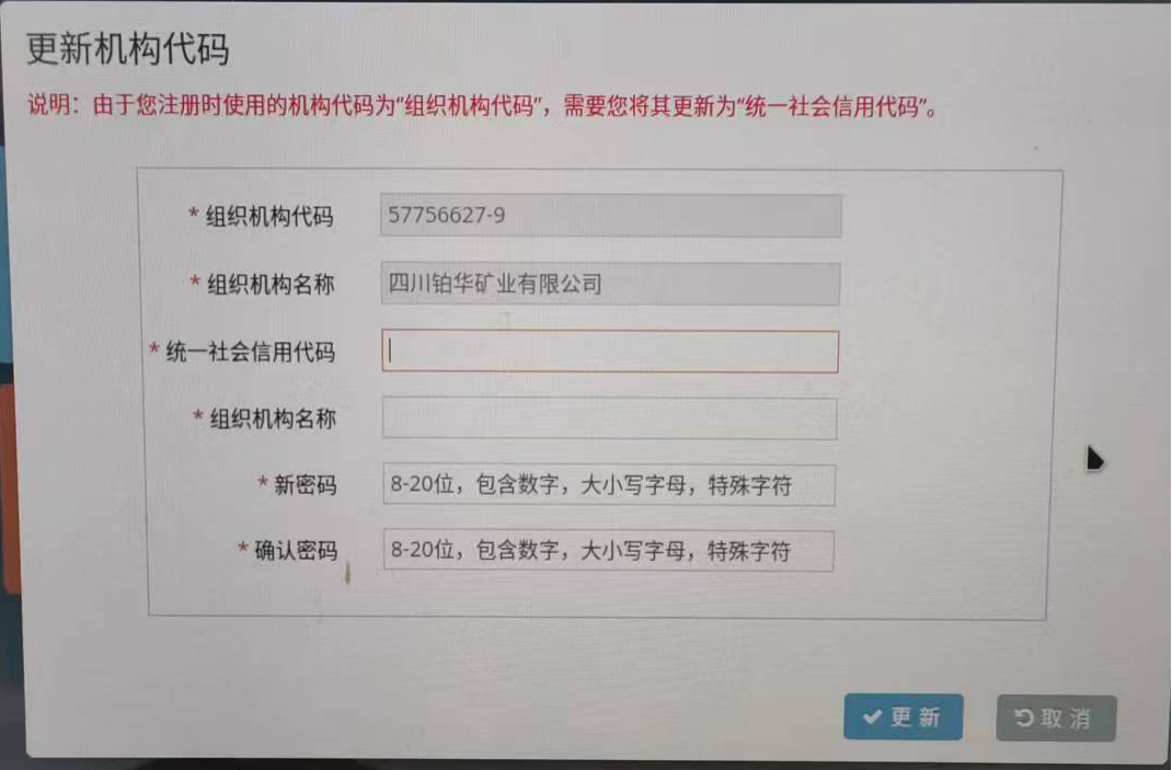 矿业权人无法采用原组织机构代码登录进行信息公示
