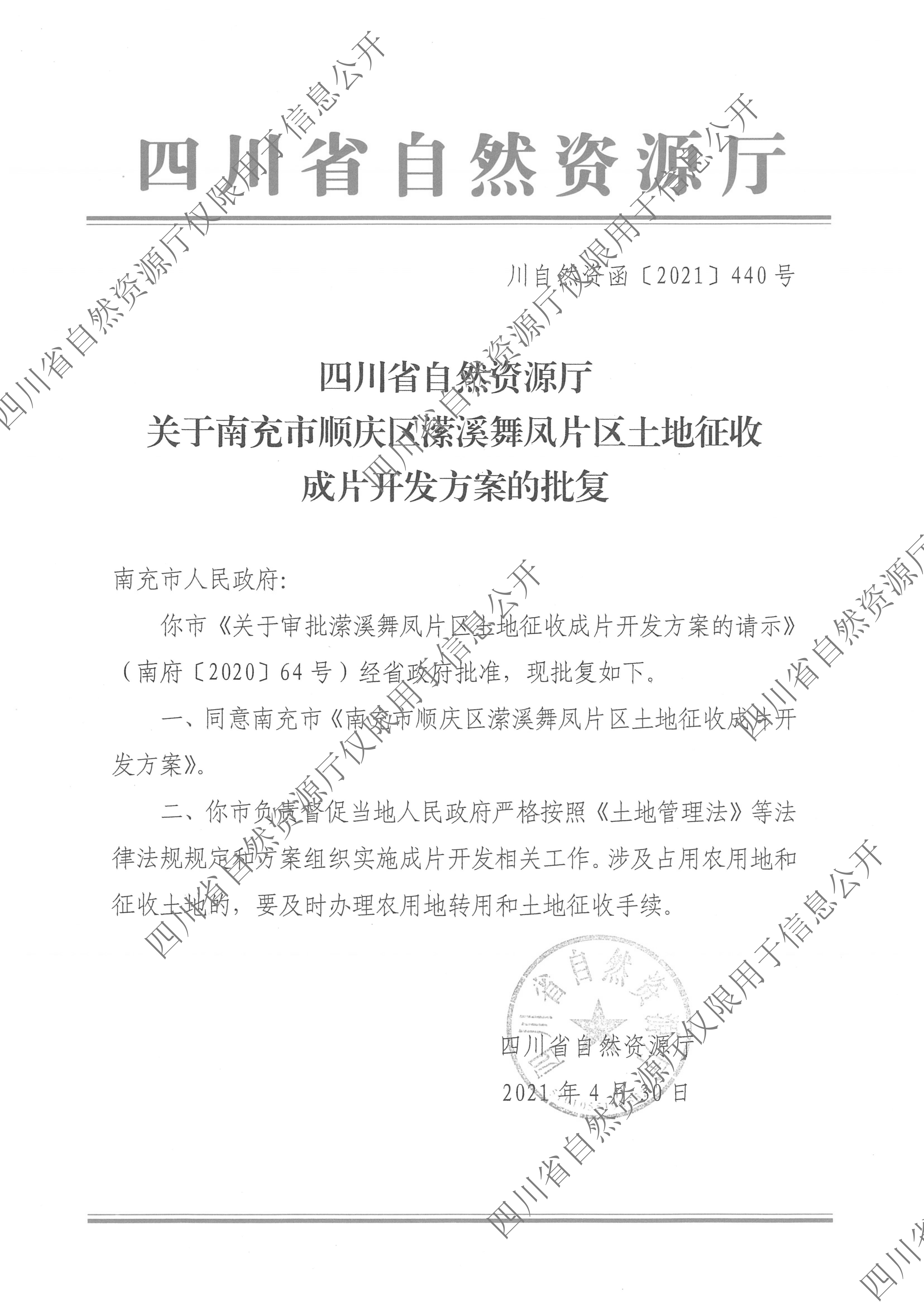 关于南充市顺庆区潆溪舞凤片区土地征收成片开发方案的批复