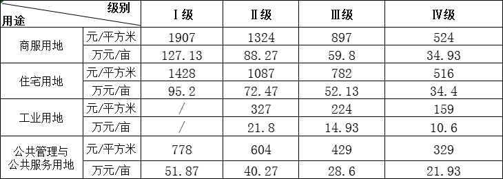备注:工业用地Ⅰ级基准地价价格参照工业用地Ⅱ级基准地价价格执行;工业用地最低价标准为96元/平方米(十三等)