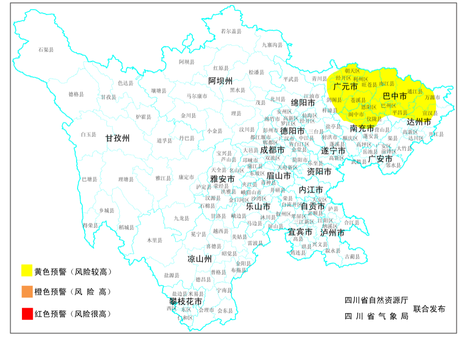 10月10日晚上到10月12日白天,巴中、广元2市大部,南充、达州2市北部发生地质灾害的风险较高(3级)。见图1。